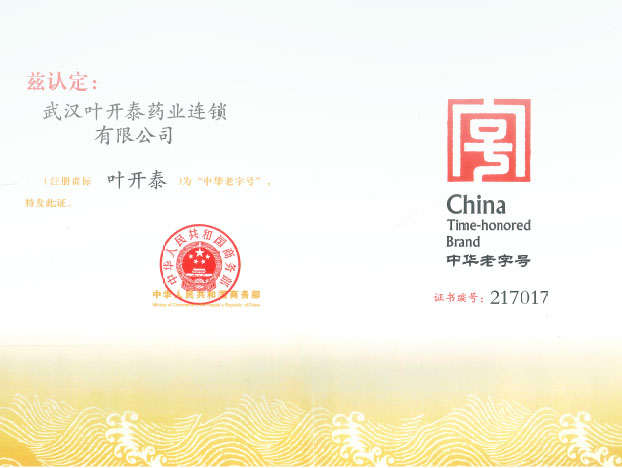 “葉開泰”商标获得国家商标局颁发的商标注册证,并于2014年成为“武汉市著名商标”。